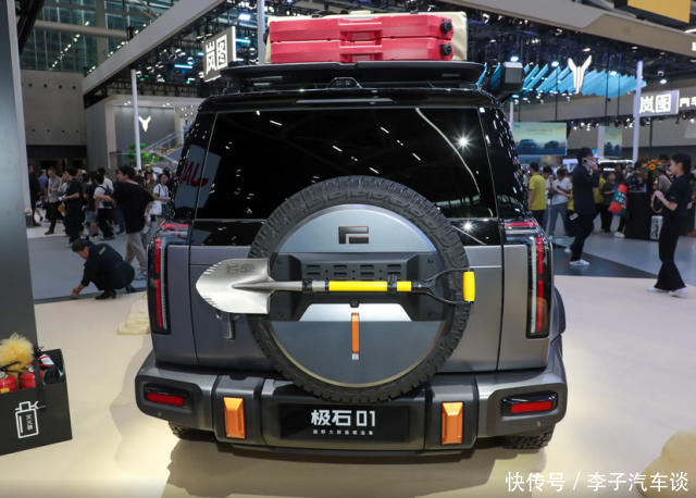 再看车尾,极石01的车尾是比较典型的越野SUV风格。左右竖向的尾灯组,造型独特,晚上一亮,老远就能认出来。外挂式备胎包,再加上侧开式尾门,不仅实用,还让车尾看起来有一种硬派的气息。底部大面积的黑色下包围,搭配银色镀铬件,层次感和运动氛围一下子就有了。而且这车外观颜色选择挺多,不管你喜欢低调还是张扬,都能找到符合心意的。